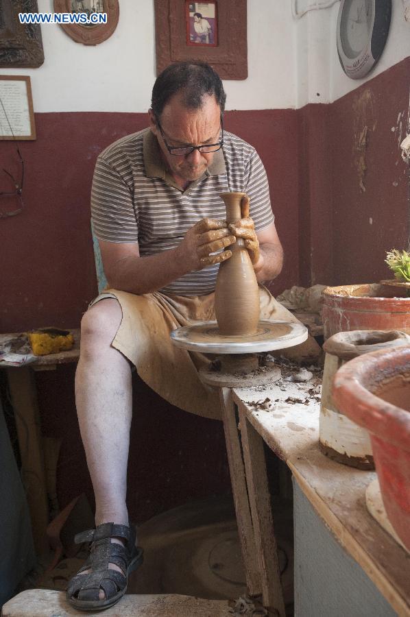 Potter Nikos Rodios makes a traditional pot in Skopelos island of Greece, June 16, 2014. (Xinhua/Liu Yongqiu)