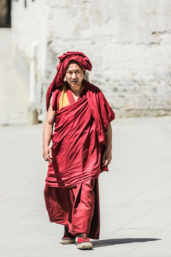 A photo shows a lama walking in the Tashilhunpo Monastery. The Tashilhunpo Monastery, located in Shigatse City in the Tibet Autonomous Region and built in 1447(Ming Dynasty), is one of the six biggest monasteries of the Gelug Sect of Chinese Tibetan Buddhism. Nearly a thousand of lamas practice Buddhism in the Tashilhunpo Monastery. [Photo: CRIENGLISH.com]