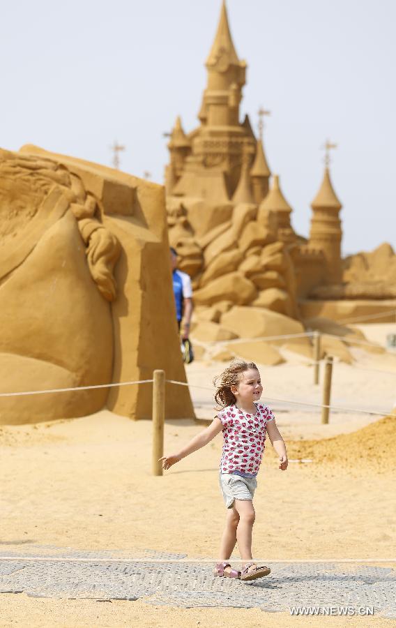 A girl walks in front of sculptures during the Sand Sculpture Festival "Frozen Summer Fun" in Ostend, Belgium, Aug. 13, 2015. (Xinhua/Ye Pingfan)