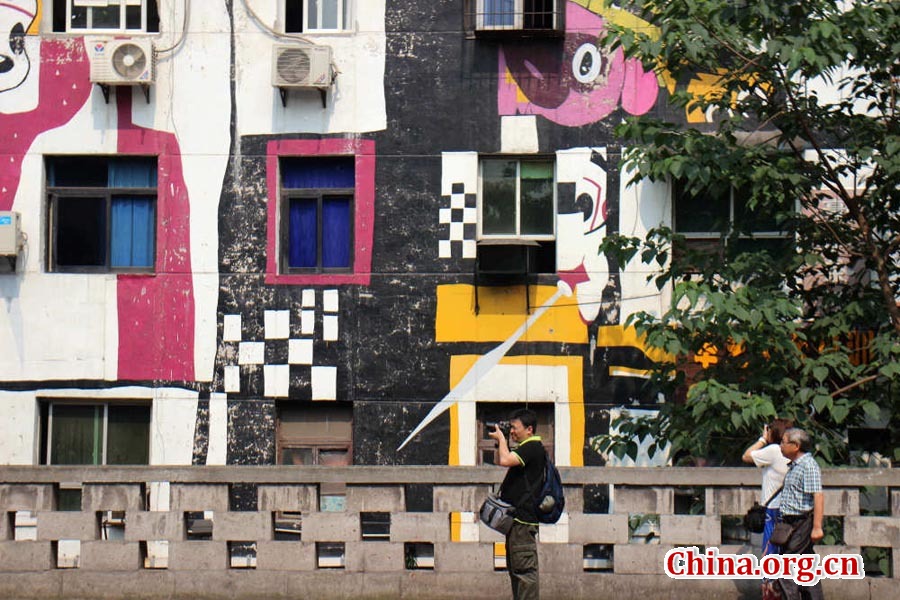 Huangjueping Street is China's largest graffiti street in Chongqing. The graffiti decorates the 40,000 square meters of wall on the buildings along the 1.25-kilometer Huangjueping Street in suburban Chongqing. Three hundred people, including artists and students from Sichuan Fine Art Institute worked on the project, which took nearly a year to complete.[China.org.cn/Photo by Liu Xianglong]