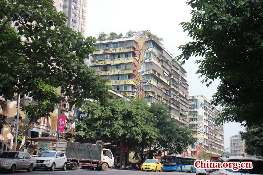 Huangjueping Street is China's largest graffiti street in Chongqing. The graffiti decorates the 40,000 square meters of wall on the buildings along the 1.25-kilometer Huangjueping Street in suburban Chongqing. Three hundred people, including artists and students from Sichuan Fine Art Institute worked on the project, which took nearly a year to complete.[China.org.cn/Photo by Liu Xianglong]