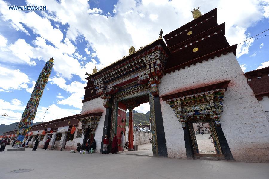 Photo taken on Sept. 21, 2015 shows the gate of Galden Jampaling Monastery in Qamdo, southwest China's Tibet Autonomous Region. Galden Jampaling Monastery was founded by Jansem Sherab Zangpo, one of disciples of Tsongkapa, the founder of Gelug Sect, in 1437. The monastery was listed as national key cultural relics protection site in 2013. (Xinhua/Liu Dongjun)