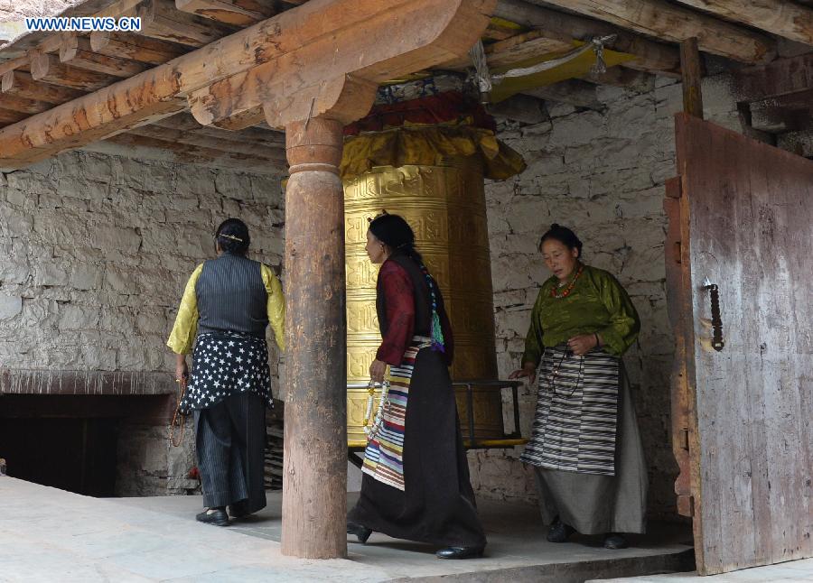 Buddhists rotate prayer wheels in Galden Jampaling Monastery in Qamdo, southwest China's Tibet Autonomous Region, Sept. 21, 2015. Galden Jampaling Monastery was founded by Jansem Sherab Zangpo, one of disciples of Tsongkapa, the founder of Gelug Sect, in 1437. The monastery was listed as national key cultural relics protection site in 2013. (Xinhua/Liu Dongjun)