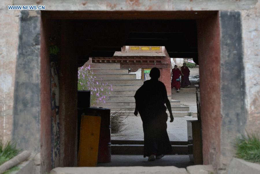 A monk enters the printing institute of Galden Jampaling Monastery in Qamdo, southwest China's Tibet Autonomous Region, Sept. 21, 2015. Galden Jampaling Monastery was founded by Jansem Sherab Zangpo, one of disciples of Tsongkapa, the founder of Gelug Sect, in 1437. The monastery was listed as national key cultural relics protection site in 2013. (Xinhua/Liu Dongjun)