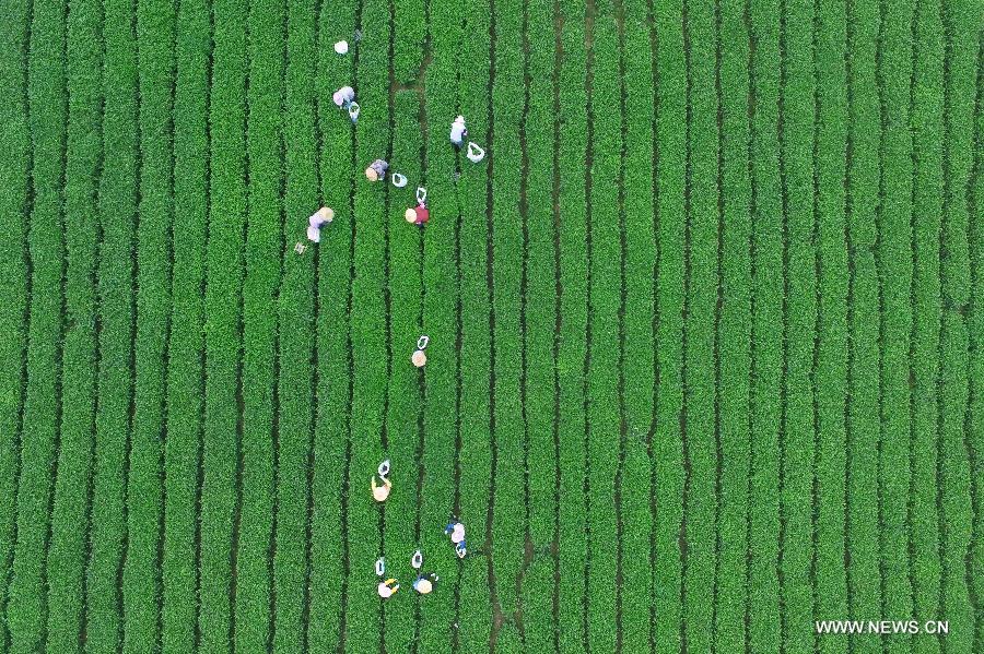 Farmers pick tea leaves at Juyuan Village of Quanzhou City, southeast China's Fujian Province, Oct. 7, 2015. (Xinhua/Zhang Jiuqiang)