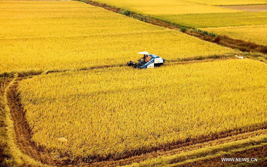 Farmers work in the rice field in Jing'an County of Yichun City, east China's Jiangxi Province, Oct. 8, 2015. (Xinhua/Xu Zhongting)