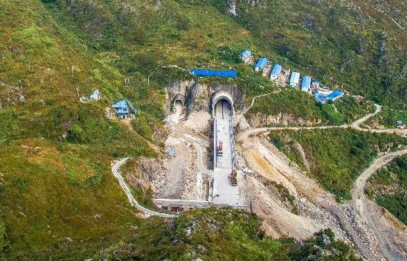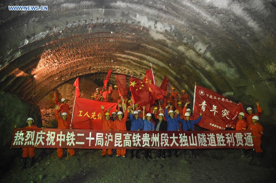 Workers cheer as they succeed in drilling a tunnel through the Dadu Mountain in Guanling Buyi and Miao Autonomous County, southwest China's Guizhou Province, Oct. 15, 2015. Stretching through the complicated karst terrain, the 11.82-kilometre tunnel, a part of the new high-speed railway connecting Shanghai and southwest China's Kunming, was drilled through on Thursday after five years' construction. (Xinhua/Liu Xu)