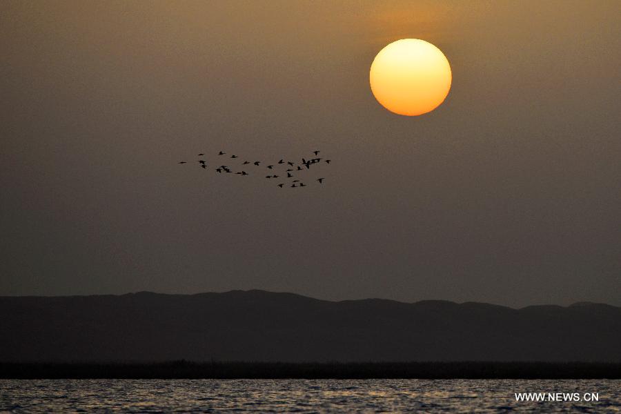 Birds fly over the Kanglake Lake surrounded by the Taklimakan Desert, the biggest moving desert in China, in the county's northwestern Xinjiang Uygur Autonomous Region. The 500-square-kilometer wetland of Kanglake lake is fed by the Qarqan River running from Mt. Kunlun, nourishing a wild variety of wildlife. (Xinhua/Li Hua)