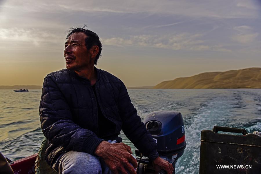 A fisherman sails on the Kanglake Lake in the Taklimakan Desert, the biggest moving desert in China, in the county's northwestern Xinjiang Uygur Autonomous Region. The 500-square-kilometer wetland of Kanglake lake is fed by the Qarqan River running from Mt. Kunlun, nourishing a wild variety of wildlife. (Xinhua/Li Yang)