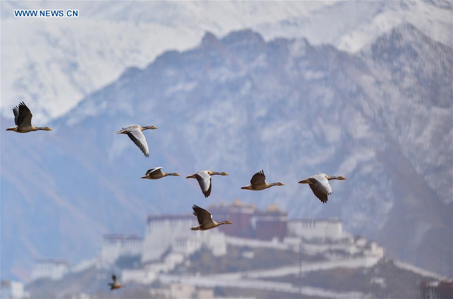 Bar-headed geese fly in the sky after snowfall in Lhasa, capital of southwest China's Tibet Autonomous Region, Dec. 3, 2015. The city embraced the first snowfall in this winter on Thursday. (Xinhua/Purbu Zhaxi)