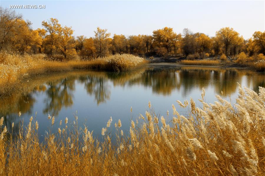 Photo taken on Oct. 25, 2014 shows the forest of populus euphratica, commonly known as desert poplar, in Luntai County, Mongolian Autonomous Prefecture of Bayingolin, northwest China's Xinjiang Uygur Autonomous Region. (Xinhua/Wang Hanbing)