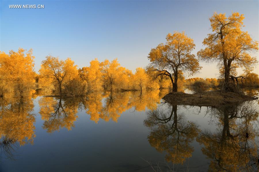 Photo taken on Oct. 25, 2014 shows the forest of populus euphratica, commonly known as desert poplar, in Luntai County, Mongolian Autonomous Prefecture of Bayingolin, northwest China's Xinjiang Uygur Autonomous Region. (Xinhua/Wang Hanbing)