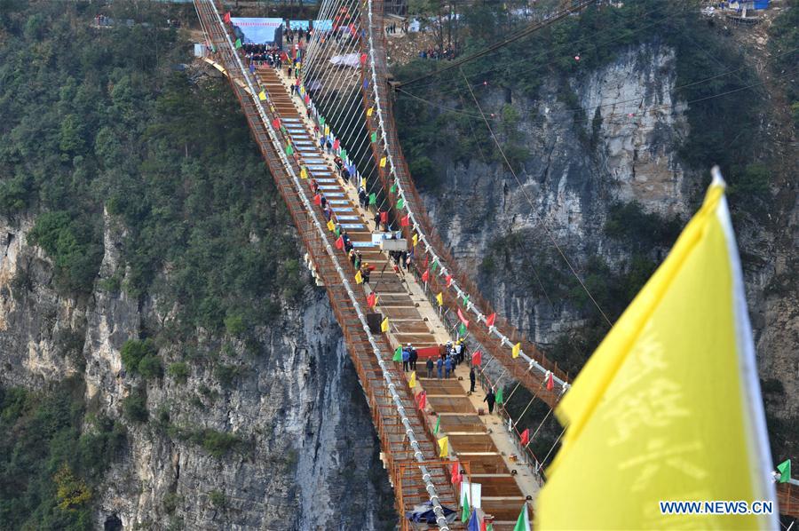 Photo taken on Dec. 3, 2015 shows the glass bridge in construction at the grand canyon of Zhangjiajie, central China's Hunan Province. A glass bridge in grand canyon of Zhangjiajie finished closure on Thursday, which is built at a height of about 300 meters and is expected to be opened to the public before May of 2016. (Xinhua/Long Hongtao)