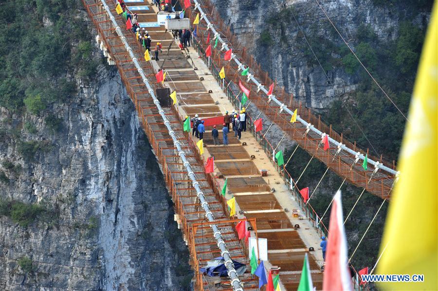 Photo taken on Dec. 3, 2015 shows the glass bridge in construction at the grand canyon of Zhangjiajie, central China's Hunan Province. A glass bridge in grand canyon of Zhangjiajie finished closure on Thursday, which is built at a height of about 300 meters and is expected to be opened to the public before May of 2016. (Xinhua/Long Hongtao)