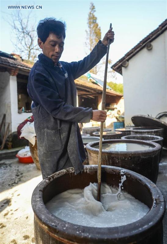 A villager prepare to make sweet potato starch vermicelli in Huzhou, east China's Zhejiang Province, Dec. 3, 2015. Local villagers have a tradition of drying sweet potato starch vermicelli and fish during the harvest season in December. (Photo: Xinhua/Xu Yu)