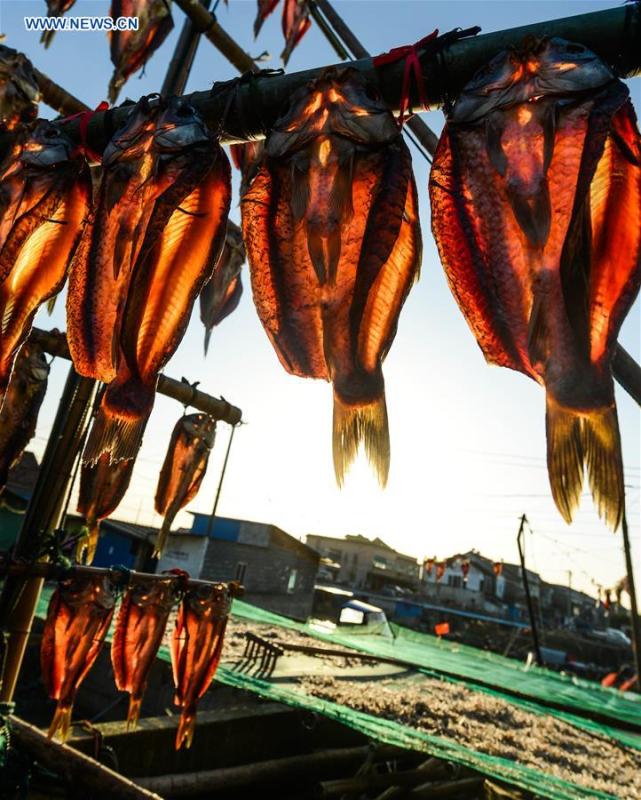 Photo taken on Dec. 3, shows dried fish at a village in Huzhou, east China's Zhejiang Province. Local villagers have a tradition of drying sweet potato starch vermicelli and fish during the harvest season in December. (Photo: Xinhua/Xu Yu)