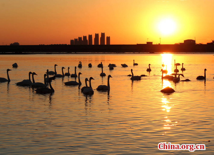 Whooper swans fly over the nature reserve for whooper swans in Rongcheng, east China's Shandong Province, Dec. 7, 2015. Swans migrating from the north converged in Rongcheng to spend winter.[China.org.cn/Photo by Lin Haizhen]