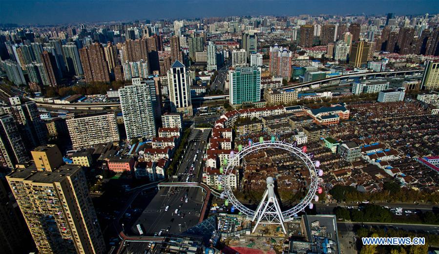 Photo taken on Dec. 8, 2015 shows bird's-eye view of a rooftop ferris wheel at the Joy City in Shanghai, east China. The rooftop ferris wheel will be put into operation before the Christmas. Tourists are able to enjoy the scenery of Suzhou River and Huangpu River on it. (Xinhua/Niu Yixin)