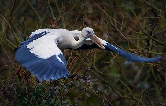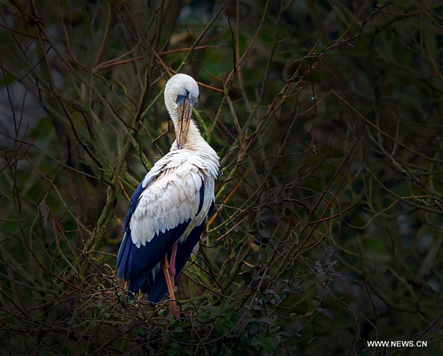 Photo taken on Dec. 5, 2015 shows an Asian open-bill stork at Poyang Lake in east China's Jiangxi Province. The Asian open-bill stork is a large wading bird in the stork family ciconiidae. It is found mainly in India, Myanmar and southern Vietnam. It is the first time to find this distinctive stork in Poyang Lake national natural reserve. (Xinhua/Xu Yong)