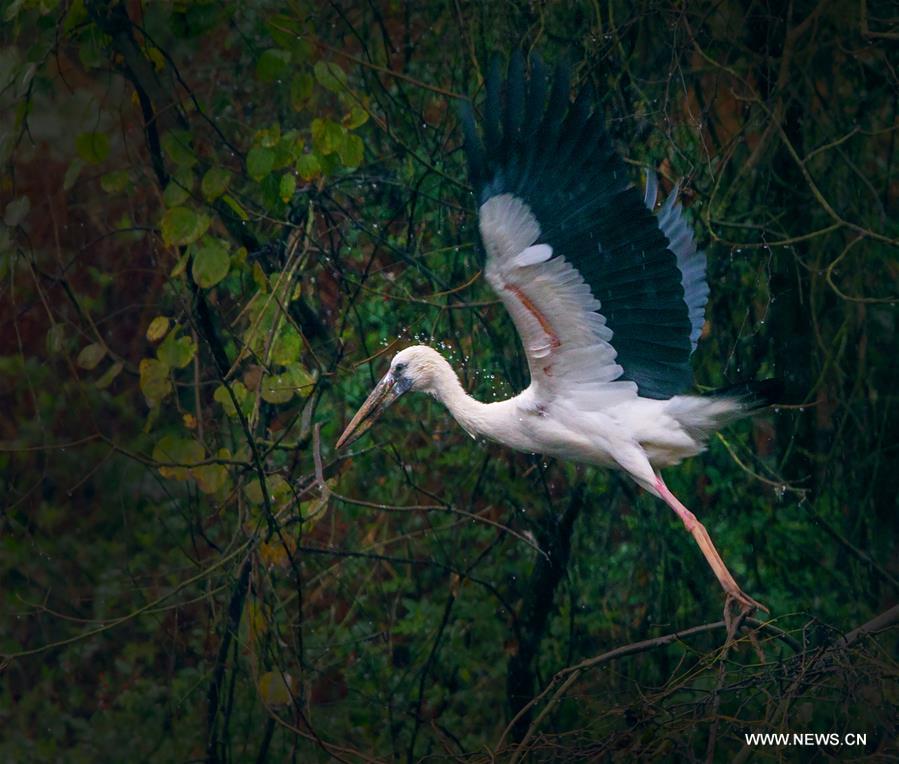 Photo taken on Dec. 5, 2015 shows an Asian open-bill stork at Poyang Lake in east China's Jiangxi Province. The Asian open-bill stork is a large wading bird in the stork family ciconiidae. It is found mainly in India, Myanmar and southern Vietnam. It is the first time to find this distinctive stork in Poyang Lake national natural reserve. (Xinhua/Xu Yong)