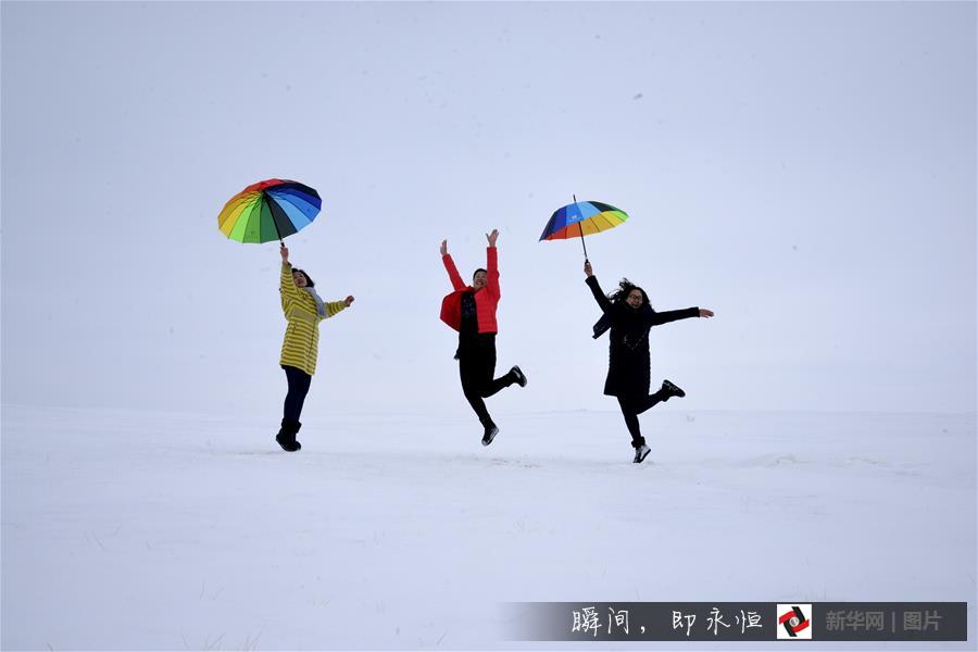 Visitors jump in snow on a grassland in north China's Inner Mongolia Autonomous Region on Nov. 27, 2015. Urad Middle Banner in western Inner Mongolia saw snowy weather recently. (Xinhua/Wen Maosheng)