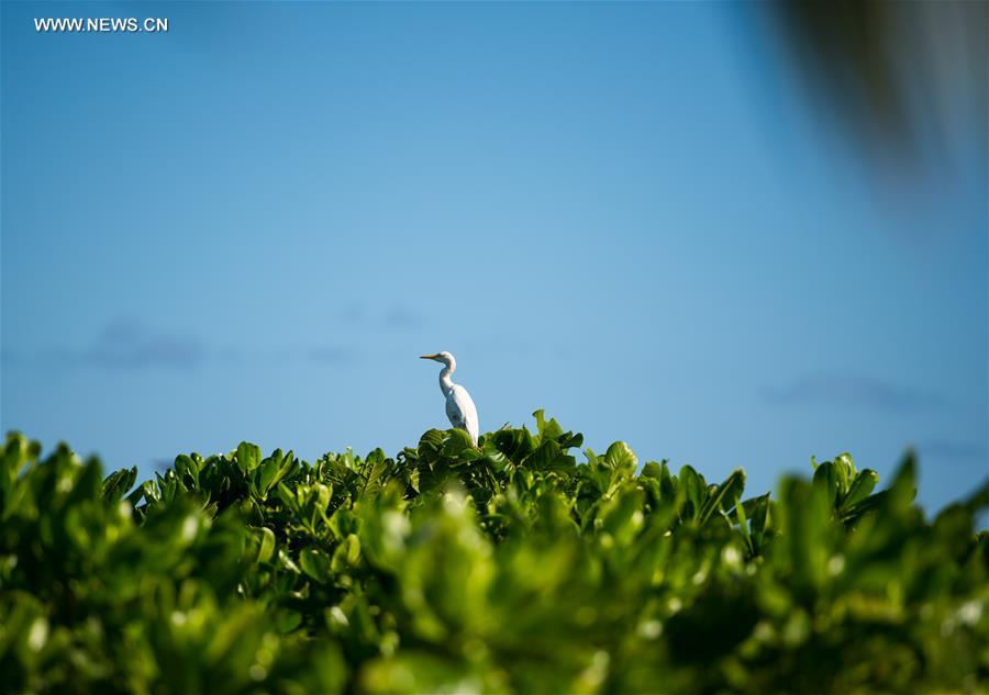 A seabird stands on a sapling on the Zhaoshu Island in Sansha City, south China's Hainan Province, Dec. 11, 2015. (Xinhua/Zhao Yingquan)