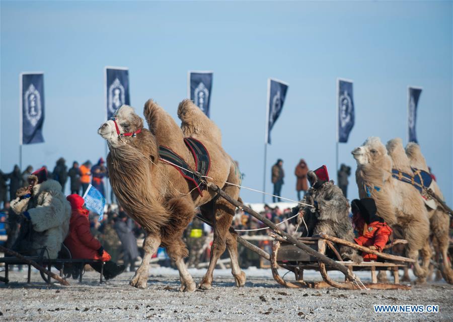 Performers ride on camel sledges at the winter Nadam fair featuring a series of ice and snow events in Hulun Buir, northern China's Inner Mongolia Autonomous Region, Dec. 23, 2015. The three-month festival, which runs through March 1, 2016, will be highlighted with a series of sports including Mongolian wrestling, horse racing, horse taming, skiing and marathon. (Xinhua/Lian Zhen)
