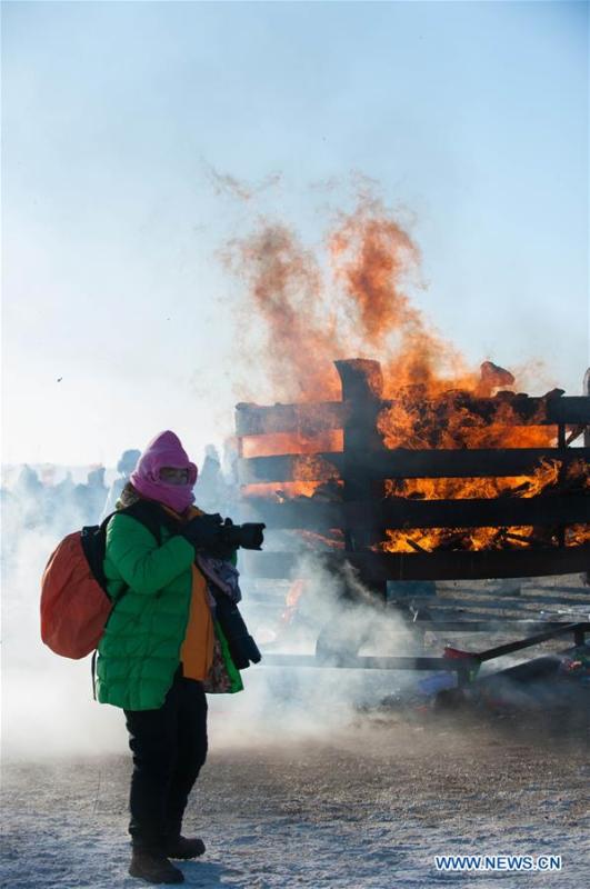 A tourist takes photos of a sacrificial ceremony at the winter Nadam fair featuring a series of ice and snow events in Hulun Buir, northern China's Inner Mongolia Autonomous Region, Dec. 23, 2015. The three-month festival, which runs through March 1, 2016, will be highlighted with a series of sports including Mongolian wrestling, horse racing, horse taming, skiing and marathon. (Xinhua/Lian Zhen)