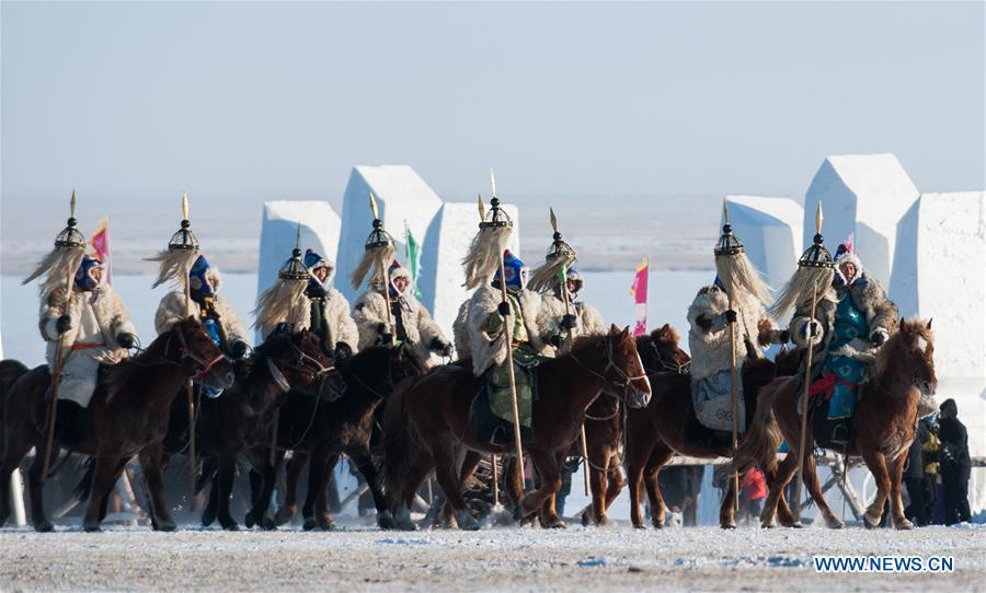 Herdsmen ride horses to participate in the winter Nadam fair featuring a series of ice and snow events in Hulun Buir, northern China's Inner Mongolia Autonomous Region, Dec. 23, 2015. The three-month festival, which runs through March 1, 2016, will be highlighted with a series of sports including Mongolian wrestling, horse racing, horse taming, skiing and marathon. (Xinhua/Lian Zhen)