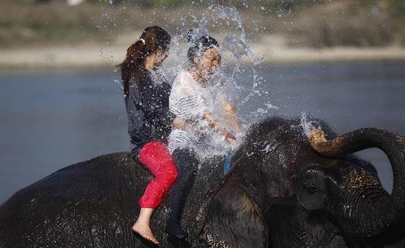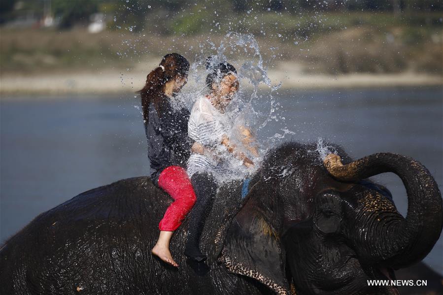 An elephant sprays water on tourists while it takes a bath in the Rapti river in Sauraha, a tourism hub in southwest Nepal's Chitwan district, Dec. 28, 2015. (Xinhua/Pratap Thapa)