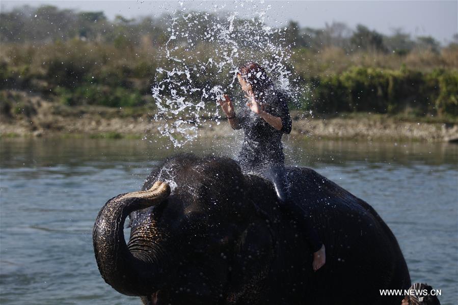 An elephant sprays water on a tourist while it takes a bath in the Rapti river in Sauraha, a tourism hub in southwest Nepal's Chitwan district, Dec. 28, 2015. (Xinhua/Pratap Thapa)