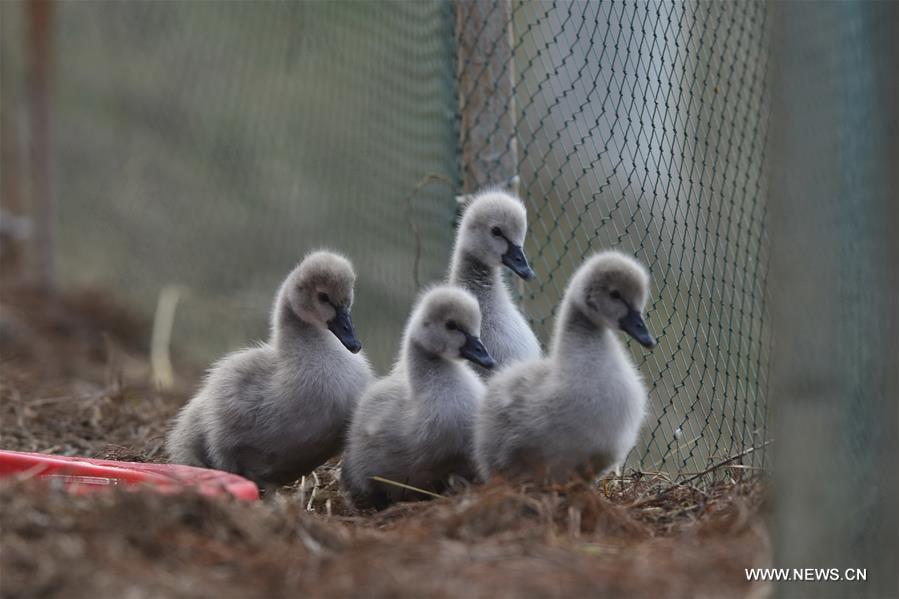 Baby swans are seen at the wetland of Aixi Lake in Nanchang City, capital of east China's Jiangxi Province, Dec. 29, 2015. The fledglings were bred naturally by a black swan couple at the wetland in this winter. (Xinhua/Zhou Mi)