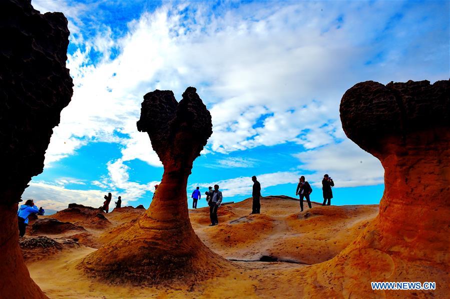 Tourists visit Yehliu Geopark in New Taipei of southeast China's Taiwan, Jan. 26, 2016. The geopark features stunning geological landscape formed by wave attack, rock weathering, earth movement and crustal movement, which make it a famous destination for tourists. (Xinhua/Zhang Guojun)