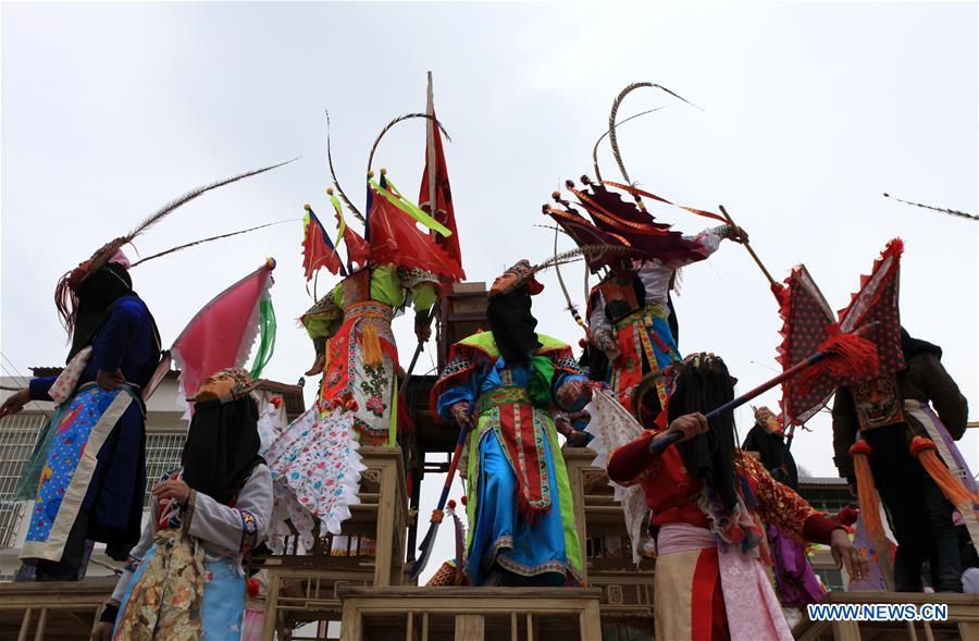 People perform Gaotai Dixi, a local folk opera staged on the open space of flat land, at Weiqi Village of Puding County, southwest China's Guizhou Province, Feb. 15, 2016. Performers wearing masks stage the opera on 48 tables laid in five layers in shape of pyramid, and sometimes jump down to sing and dance. The Gaotai Dixi opera mainly reflects and tells wartime stories in ancient times. (Photo: Xinhua/Lu Wei)