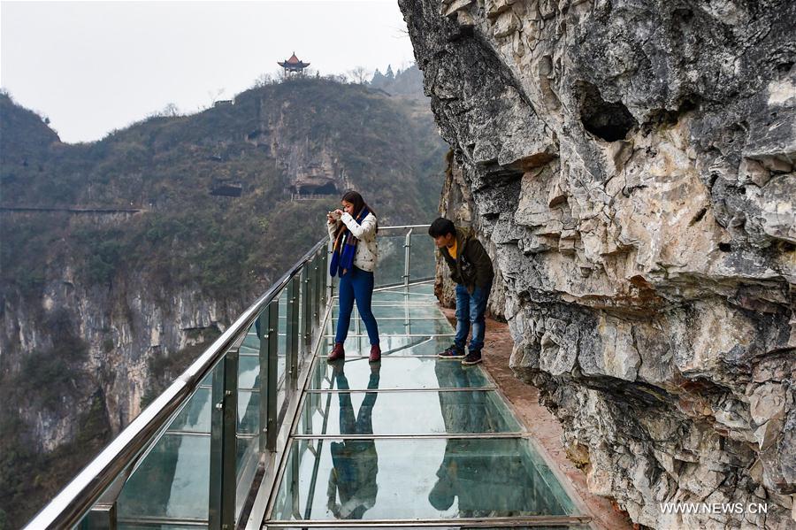 Tourists walk on a glass skywalk in the National Mine Park of Tongren City, southwest China's Guizhou Province, Feb. 24, 2016. The 1,005-meter-long and 1.6-meter wide glass skywalk, with more than 100 meters above the valley bottom, has passed a safety test and will be opened to the public in May. (Xinhua/Liu Xu)