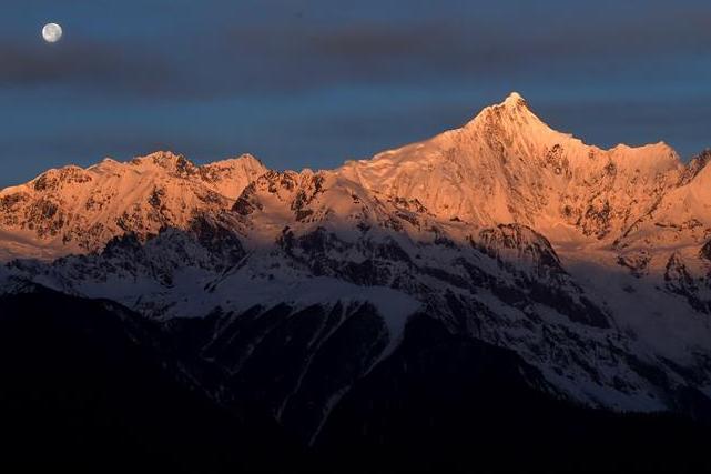 The moon hangs in the sky as sunshine casts light on the top of the Meili Snow Mountains in Deqen County of Diqing Tibetan Autonomous Prefecture, southwest China's Yunnan Province, March 25, 2016. The Meili Snow Mountains, with the highest peak Kawagebo at an altitude of 6,740 meters, is always shrouded by fog and clouds. It is rare to see its mountain tops in the sunshine with a moon in the sky. (Photo: Xinhua/Lin Yiguang)