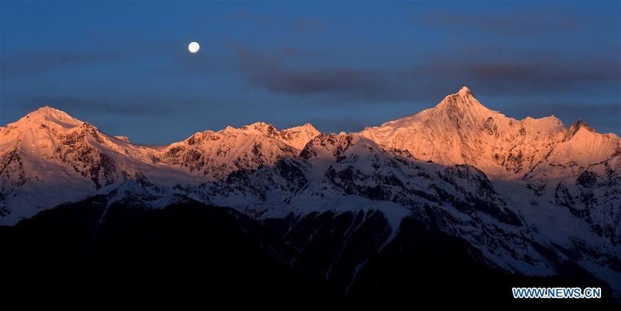 The moon hangs in the sky as sunshine casts light on the top of the Meili Snow Mountains in Deqen County of Diqing Tibetan Autonomous Prefecture, southwest China's Yunnan Province, March 25, 2016. The Meili Snow Mountains, with the highest peak Kawagebo at an altitude of 6,740 meters, is always shrouded by fog and clouds. It is rare to see its mountain tops in the sunshine with a moon in the sky. (Photo: Xinhua/Lin Yiguang)