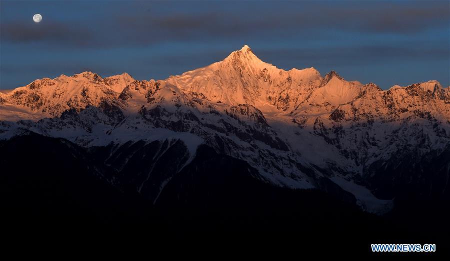 The moon hangs in the sky as sunshine casts light on the top of the Meili Snow Mountains in Deqen County of Diqing Tibetan Autonomous Prefecture, southwest China's Yunnan Province, March 25, 2016. The Meili Snow Mountains, with the highest peak Kawagebo at an altitude of 6,740 meters, is always shrouded by fog and clouds. It is rare to see its mountain tops in the sunshine with a moon in the sky. (Photo: Xinhua/Lin Yiguang)