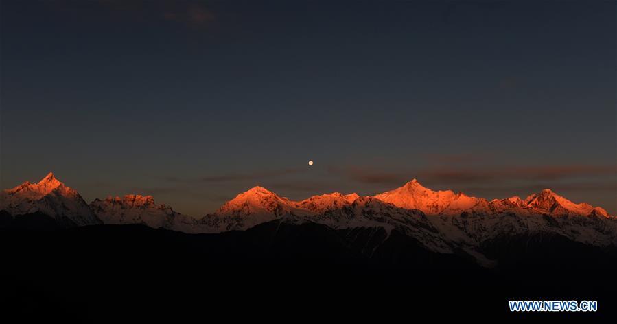 The moon hangs in the sky as sunshine casts light on the top of the Meili Snow Mountains in Deqen County of Diqing Tibetan Autonomous Prefecture, southwest China's Yunnan Province, March 25, 2016. The Meili Snow Mountains, with the highest peak Kawagebo at an altitude of 6,740 meters, is always shrouded by fog and clouds. It is rare to see its mountain tops in the sunshine with a moon in the sky. (Photo: Xinhua/Lin Yiguang)