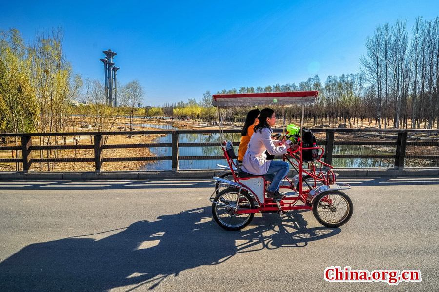 Olympic Forest Park is located to the north of the 'Bird's Nest' and 'Water Cube.' Shrouded in trees, reeds and grass and spotted with ponds, the 11.5-square-kilometer Olympic National Forest Park has become a popular destination for tourists to inhale some fresh air in Beijing. [China.org.cn/Photo by Feng Jun]