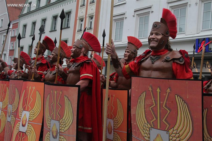 Performers dressed as soldiers participate in the parade of Gaeubodenvolksfest, in southern German city of Straubing, on Aug. 12, 2016. The Gaeubodenvolksfest, the second largest folk festival in Bavaria, was founded in 1812 as an agricultural festival to organize an annual meeting of the people in the Danube region. [Xinhua]
