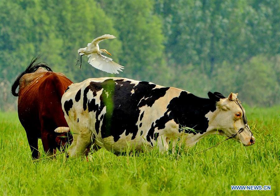 An egret flies over the back of a cattle in Dawangmiao Village of Jinan City, capital of east China's Shandong Province, Sept. 3, 2016. (Xinhua/Zhang Rufeng)