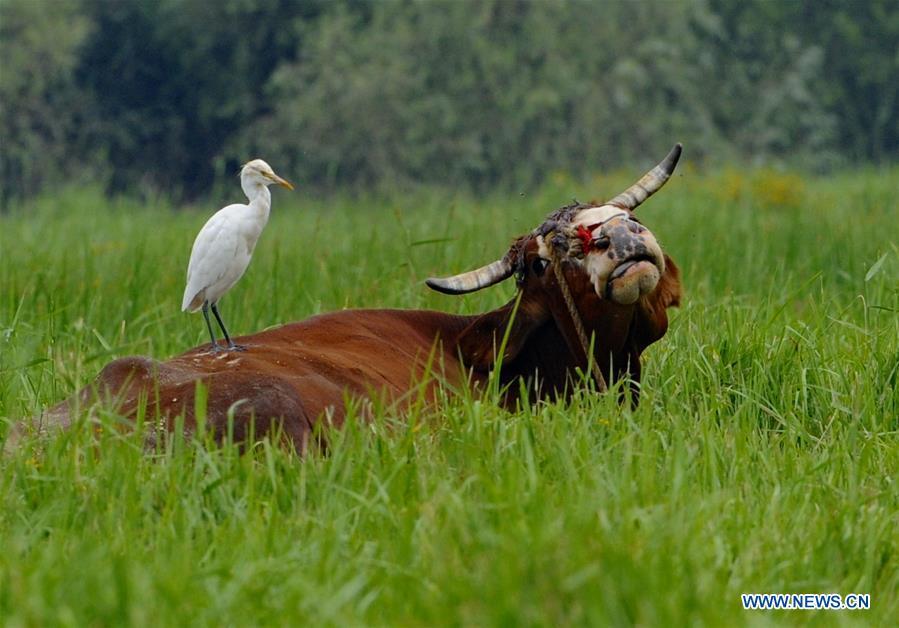 An egret rests on the back of a cattle in Dawangmiao Village of Jinan City, capital of east China's Shandong Province, Sept. 3, 2016. (Xinhua/Zhang Rufeng)