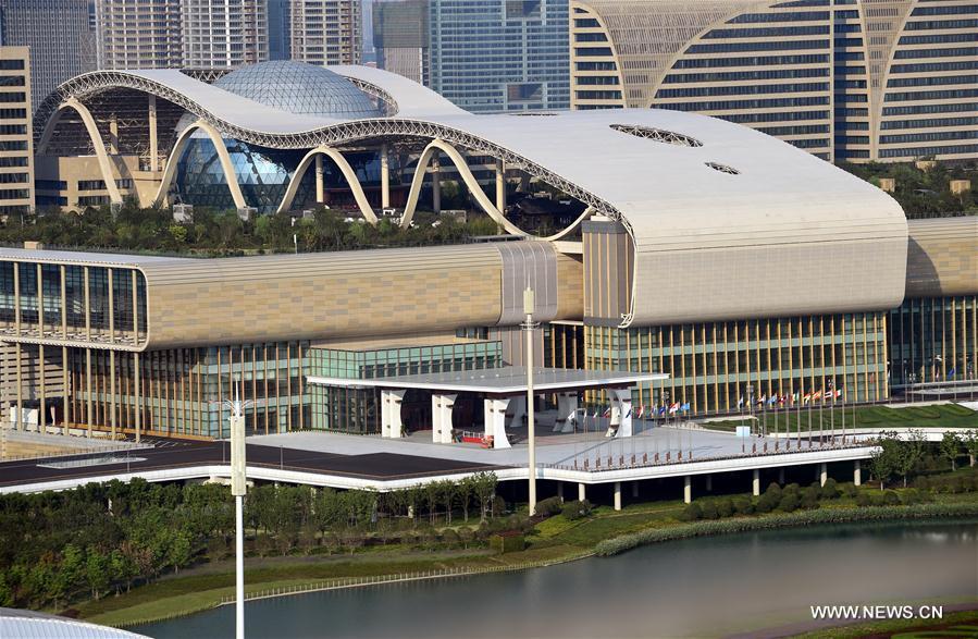 Photo taken on Sept. 2, 2016 shows the Hangzhou International Expo Center in Hangzhou, capital city of east China's Zhejiang Province. The G20 Summit will be held in Hangzhou from Sept. 4 to 5. (Xinhua/Wang Dingchang)