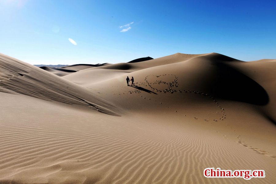 Badain Jaran Desert, the third largest desert in China, is located in Alxa Right Banner, the west of Inner Mongolia. It covers an area of 47,000 square kilometers, and contains Bilutu Peak – the world's highest stationary dune rising over 500 meters and peaking at 1609 meters above sea level. It is often referred to as Qomolangma, and is also known as Mount Everest in the West. The desert also features over 140 lakes that lie between the dunes, although its annual precipitation is less than 40 millimeters. Beautiful views attract visitors from both home and abroad. [China.org.cn/Photo by Yuan Chungang]