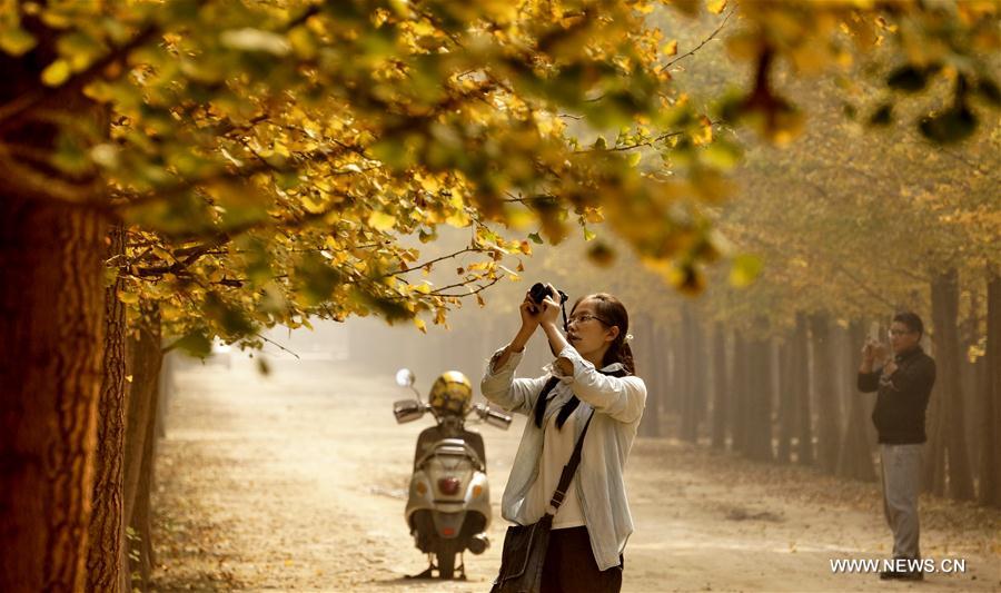 A woman takes photos of ginkgo trees at a plantation in Zhanggezhuang Village of Changping District in Beijing, capital of China, Oct. 13, 2016. (Xinhua/Li Xin)