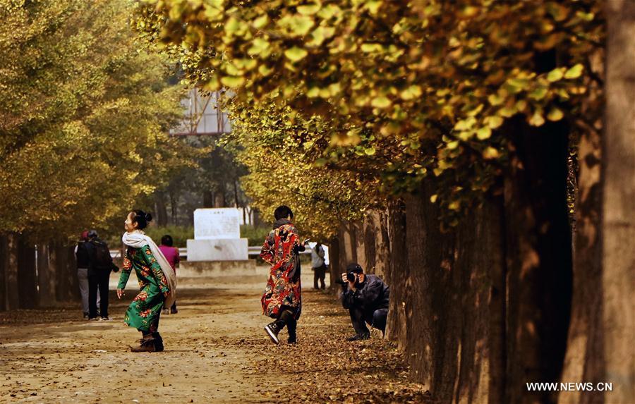 People take photos under ginkgo trees at a plantation in Zhanggezhuang Village of Changping District in Beijing, capital of China, Oct. 13, 2016. (Xinhua/Li Xin)