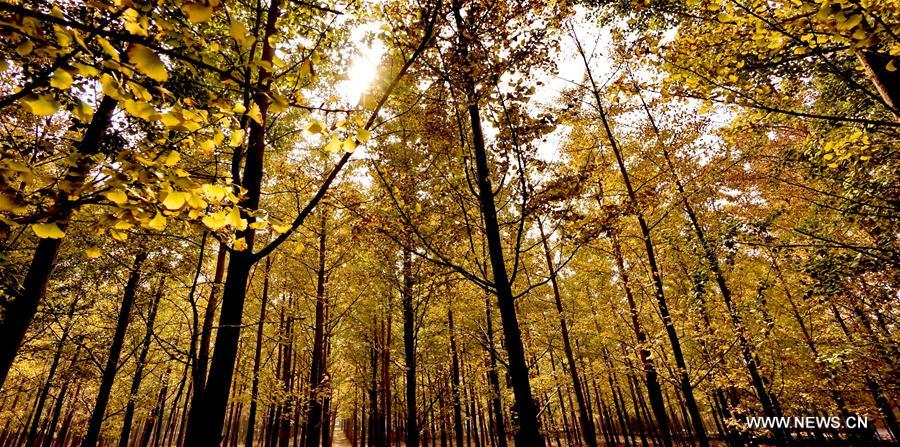 Photo taken on Oct. 13, 2016 shows ginkgo trees at a plantation in Zhanggezhuang Village of Changping District in Beijing, capital of China. (Xinhua/Li Xin)