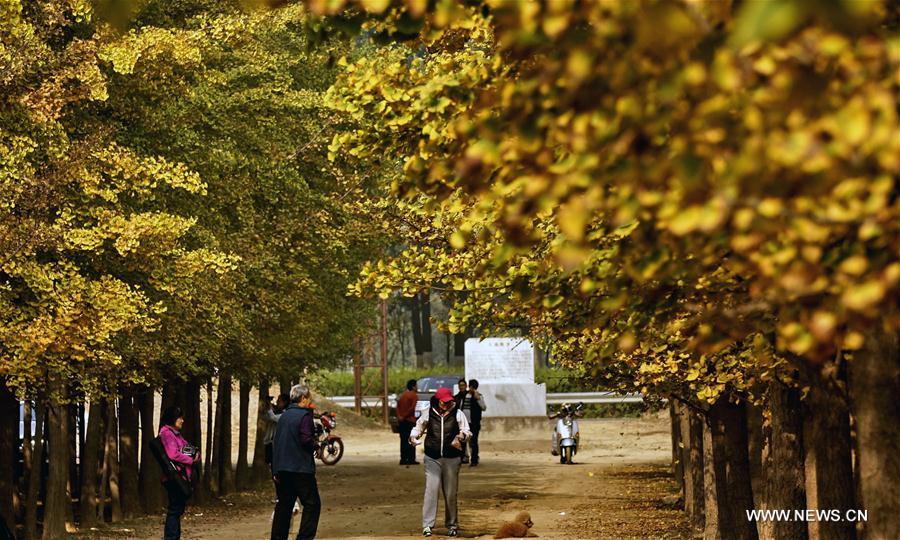 People walk under ginkgo trees at a plantation in Zhanggezhuang Village of Changping District in Beijing, capital of China, Oct. 13, 2016. (Xinhua/Li Xin)