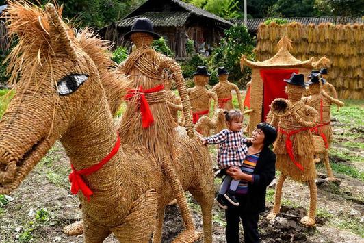 Scarecrows are seen at an exhibition in Gongshui river wetland park in Xuanen County, central China's Hubei Province, Oct. 24, 2016. Highlighting local farming culture and countryside life, the scarecrow exhibition attracted many visitors. (Xinhua/Song Wen)